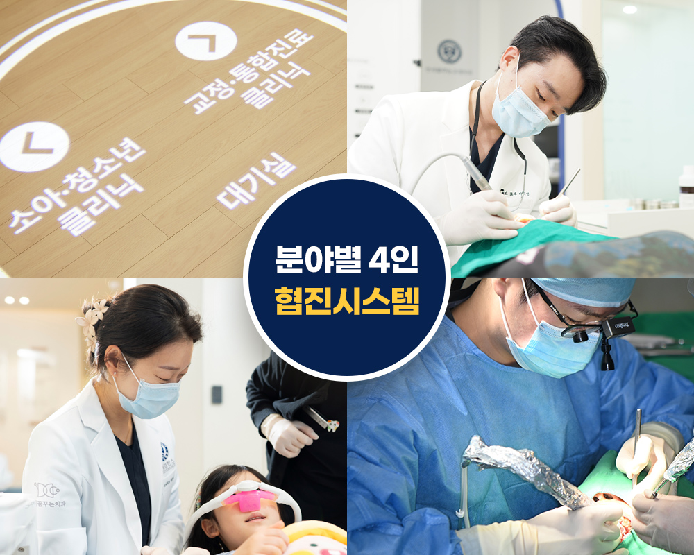 분야별 4인 전문 의료진이 협진하는 통합 진료 시스템을 운영하고 있습니다.교정치료는 물론, 고난도 임플란트·심미치료·소아치과까지 한 공간에서 체계적으로 진료합니다.