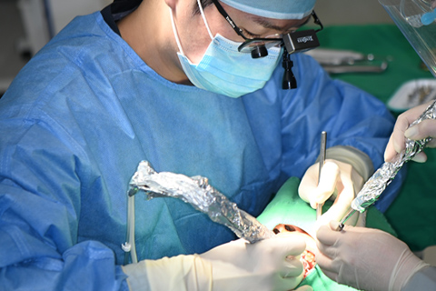 시술한 곳을 깨끗하게 소독하고 임플란트가 잘 식립되었는지 확인합니다.